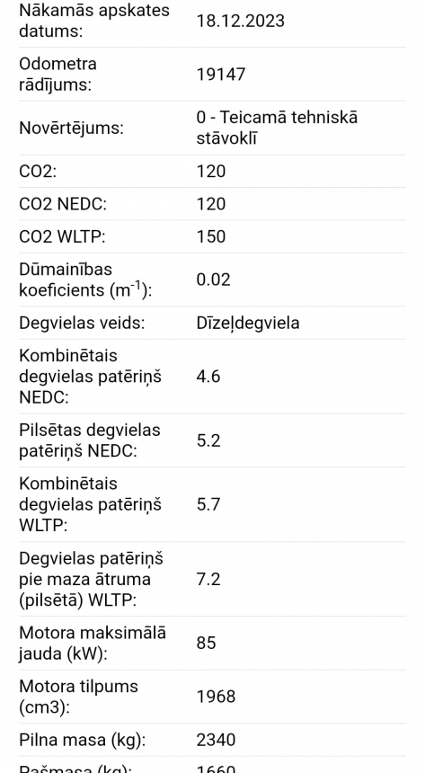 TransportlÄ«dzekļa ekspluatÄcijas nodoklis 84eur uz gadu (pilnÄ apmÄrÄ); CO2: 120;